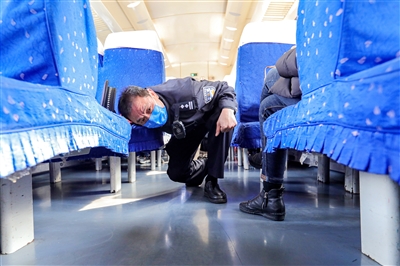 来鸿在排查硬座车厢的治安隐患。