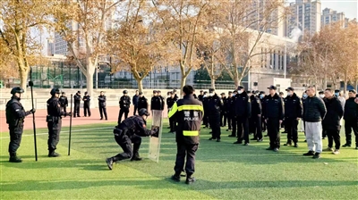 12月20日,西安市公安局雁塔分局明德门派出所联合分局巡特警大队、陕西师范大学保卫处开展警保联动处突演练活动。 本报记者 梁爽 通讯员 王永春 摄