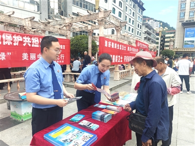 6月5日,商洛市镇安县人民检察院组织干警前往县城中心广场,开展生态环境保护法治宣传活动。图为检察干警向过往群众普及生态环保法律知识、介绍检察机关守护绿水青山的重要职能。