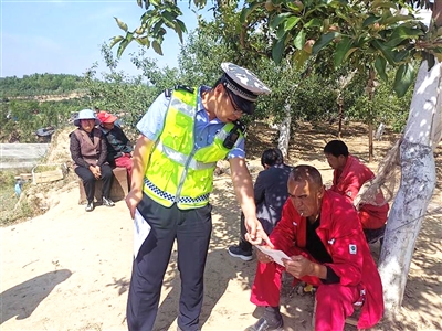 5月27日,志丹县公安局交警大队保安中队民警在“保安街道办事处2025年夏季果园管理现场会”上,开展交通安全宣传活动。图为民警向群众讲解交通安全注意事项。