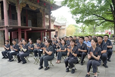 6月6日下午,泾阳县人民法院参训青年干警走进安吴青训班纪念馆参观学习。图为参观结束后,青年干警以“小板凳”形式召开交心会。 马宇飞 摄