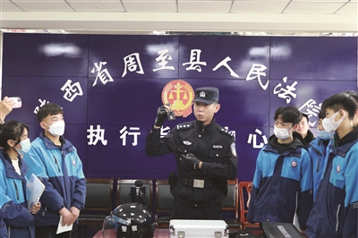 周至县人民法院举办“弘扬宪法精神 守护祖国未来”法院开放日活动,邀请80余名师生走进法院参观,了解宪法知识,体验警用器械。 本报记者 刘嘉 摄