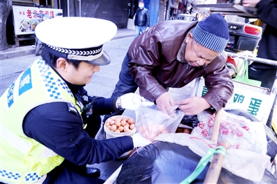 民警给张喜平卖鸡蛋搭把手。 高博 摄