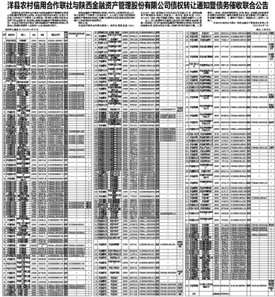 洋县农村信用合作联社与陕西金融资产管理股份有限公司债权转让通知暨债务催收联合公告