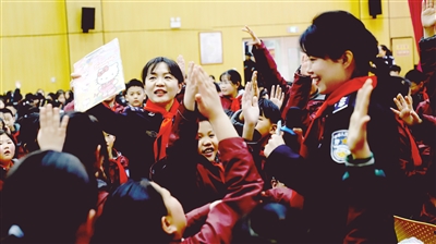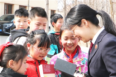 3月4日,西安市公安局灞桥分局妇委会民辅警赴辖区东城第二学校开展“巾帼女警进校园”讲雷锋故事暨普法宣传活动。图为民警与小学生进行有奖问答互动。 本报记者 姜争民 通讯员 丁仁圣 摄 |