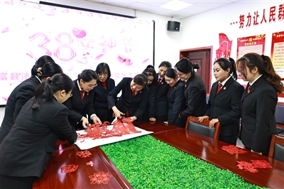 3月5日,延安市富县人民法院开展庆“3·8”剪纸文化主题活动。图为法院干警在延安市民间文艺家协会会员鲁跃芳的指导下,尝试创作剪纸作品。李志勇 通讯员 贺金霞 摄