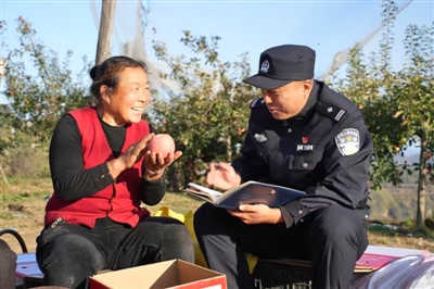 在延安,苹果是不少群众的致富产业,枣园街道也不例外。作为一个90%辖区属于农村的城郊派出所,除了正常办案外,守护群众的“钱袋子”也是民辅警的重要工作。每到苹果成熟季,付瑞就常在地头“转圈圈”,果农们打趣地叫他“苹果所长”。