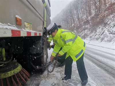 当天7时许,大队领导带领民辅警到岗,重点针对陡坡、弯道等易结冰打滑路段,加大警力部署。他们指挥车辆缓慢通行,提醒驾驶人保持车距、减速慢行,对受困车辆及时提供加挂防滑链、推车等帮助;与路政等部门紧密协作,撒布融雪剂、清扫积雪,提升道路通行能力。大队民辅警利用微信、微博等新媒体平台,不间断发布路况信息和出行提示,引导群众合理规划出行路线。