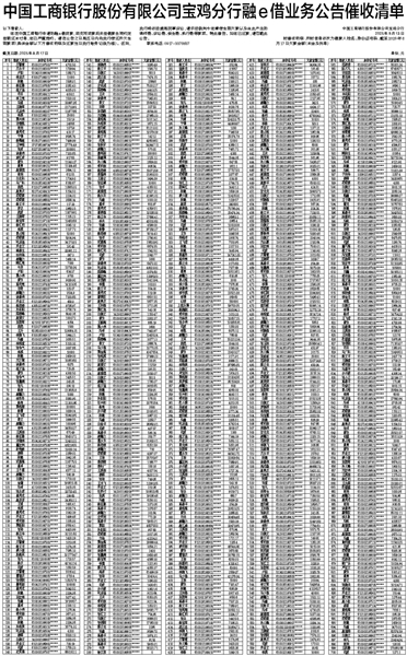 中国工商银行股份有限公司宝鸡分行融e借业务公告催收清单